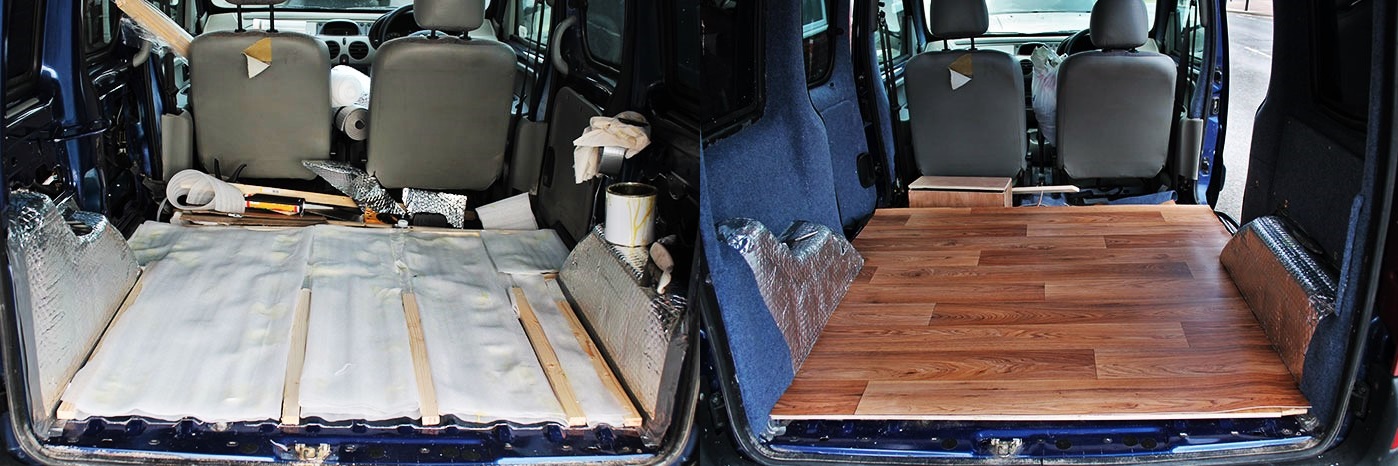 Rimossi i sedili posteriori, ha installato un pianale in legno che faccia da comoda base per il letto e lo ha circondato di tendine.